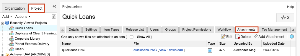 Select ADMIN > Project, then select Attachments.