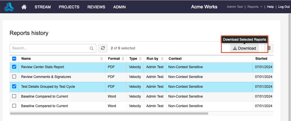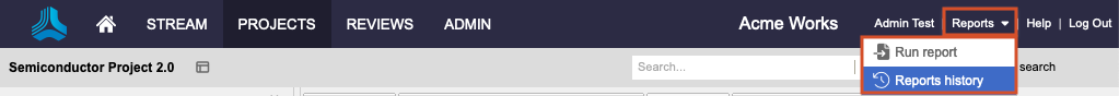 The information on the Reports history page is maintained for a rolling 7-day period. After this period, reports are removed from the history. This feature allows you to return to Jama Connect once a report has completed, because reports aren't generated instantly.