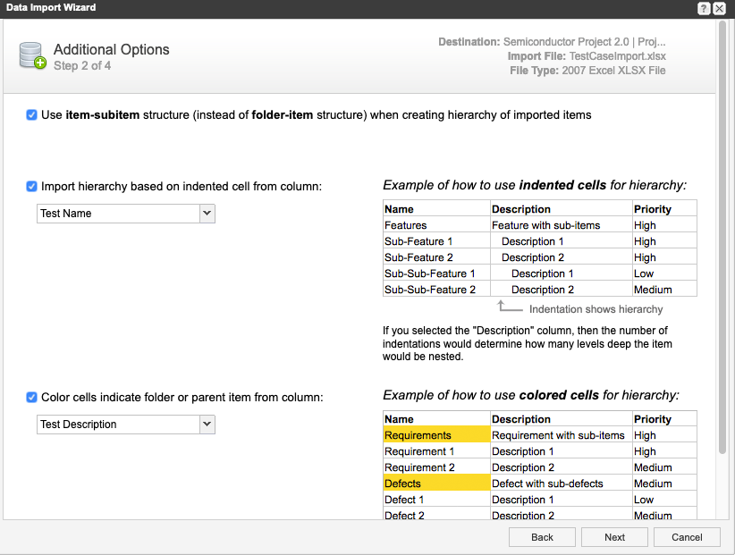 On the Additional options page, indicate whether your worksheet uses cell color or indentation for hierarchy, then select Next.