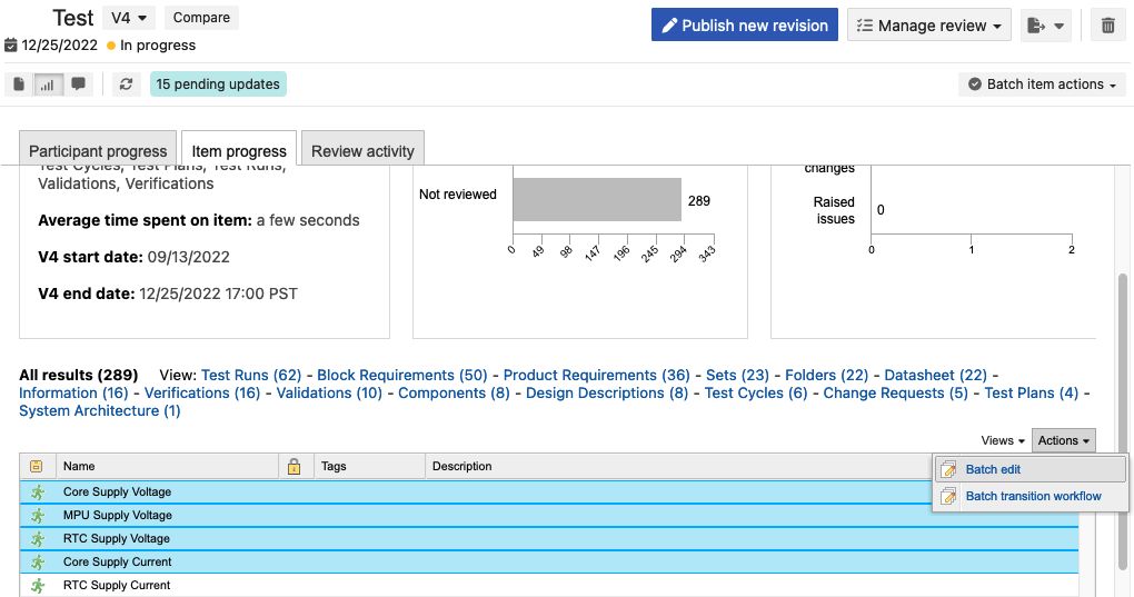 (Review moderator only) Select the items you want to edit in the item progress tab of review statistics, then select Batch edit.