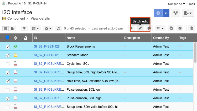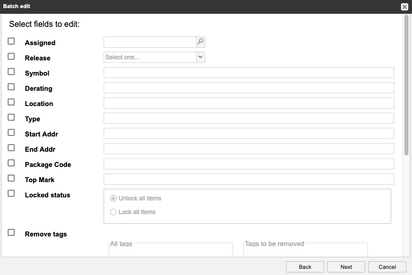 Because the batch-edit method can't be used for some items types, use instead a Jama Connect to Excel round trip for rich text fields and the Test runs window to batch update test runs.