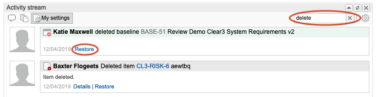 In the search field at the top of the Activity Stream widget, type delete to display all recently deleted items.
