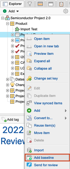 From the Explorer tree, select a component, set, folder, or item, then select Add baseline from the menu.
