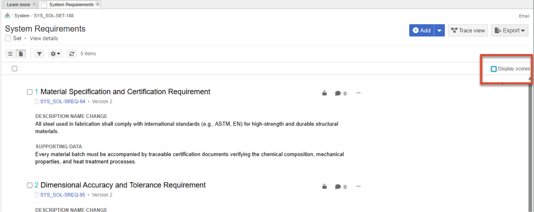 After analyzing your requirements, refresh Document View , then select Display scores.