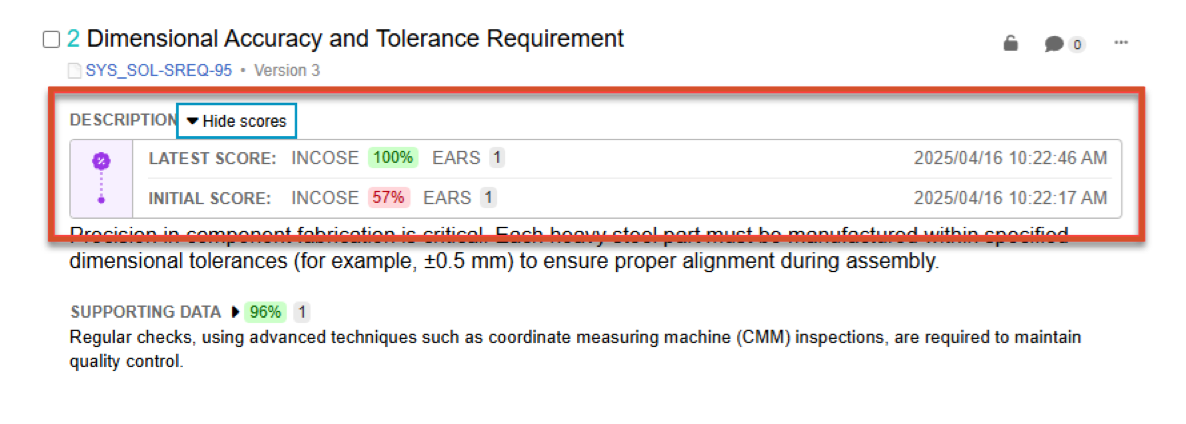 Select the Jama Connect Advisor score to expand the view of the Initial Score and Latest Score, if available.