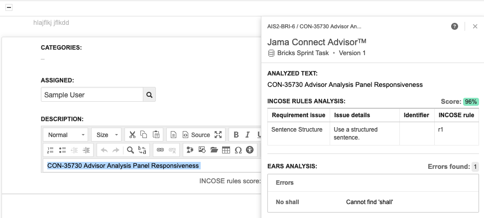 When Jama Connect Advisor is enabled and configured by an organization admin, you can use it to analyze the quality of the text of a requirement text against industry-standard rules.