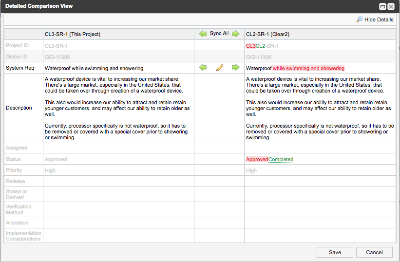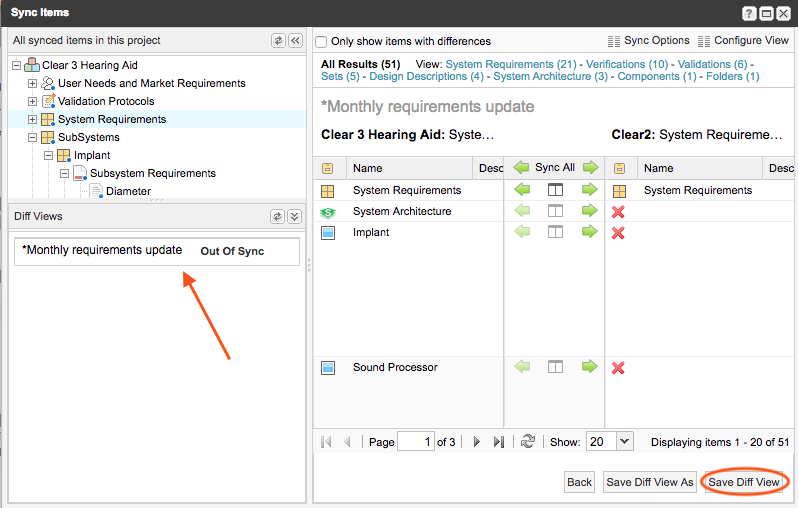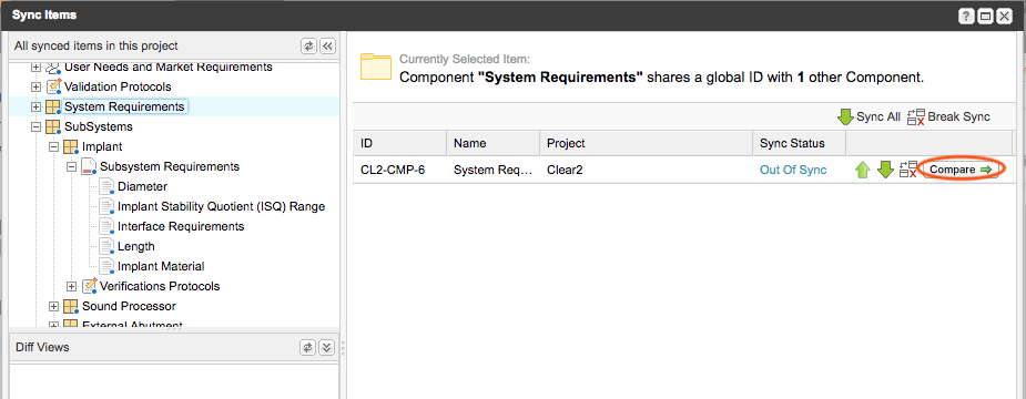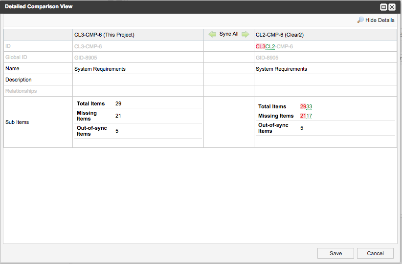 If the item is out of sync, select it to open a Detailed Comparison View of those differences.