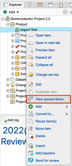 Open the Sync Items window: In the Explorer Tree, select the item, component, or set you want to sync, then select View synced items.