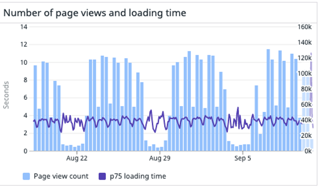 The P75 total page load time (from request to full browser paint) averages 3.41 seconds.