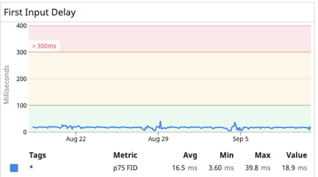 First Input Delay (FID) averages 16.5ms across the cloud environment and is a critical component of a responsive web experience.
