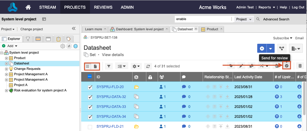 From Project > Project toolbar — Select Explorer, Filters, Releases, Baselines, or Test Plans, right-click on the item or collection of items you want to include in the review, then select Send for review.