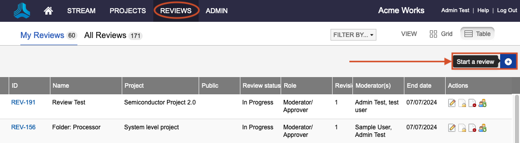 You can create reviews for any item or group of items in a project. By default, you are the moderator for any reviews you create.