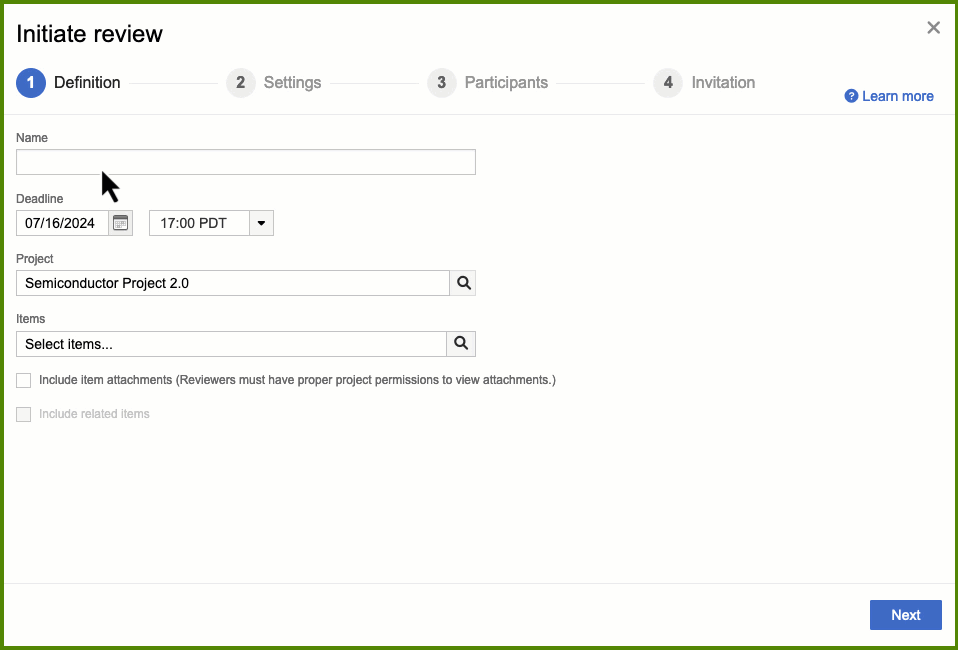 Definition — Name your review, set a deadline, and select items to be reviewed.