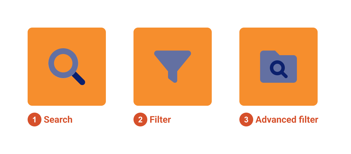 The process of finding what you need consists of a simple SEARCH for a word or phrase, then refining your search results with a FILTER, and optionally saving a filter for future use.