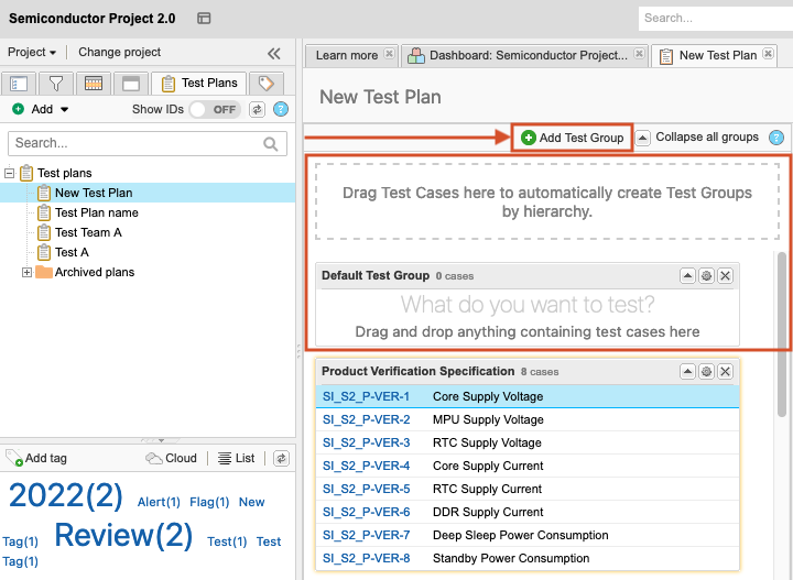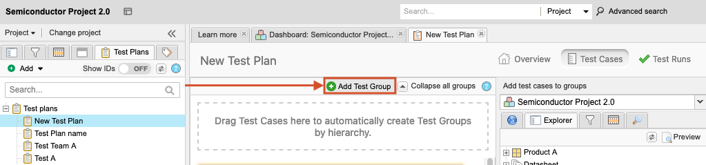 Select the Test Plans tab in the left panel, then choose the plan where you want to add a test group.