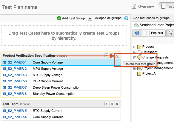 Test cases are added to a plan in groups, which makes it easier for others to understand and run your test plan. For example, you might want a group to include all the cases for a specific aspect of the product, or you might want to group by test location or tester